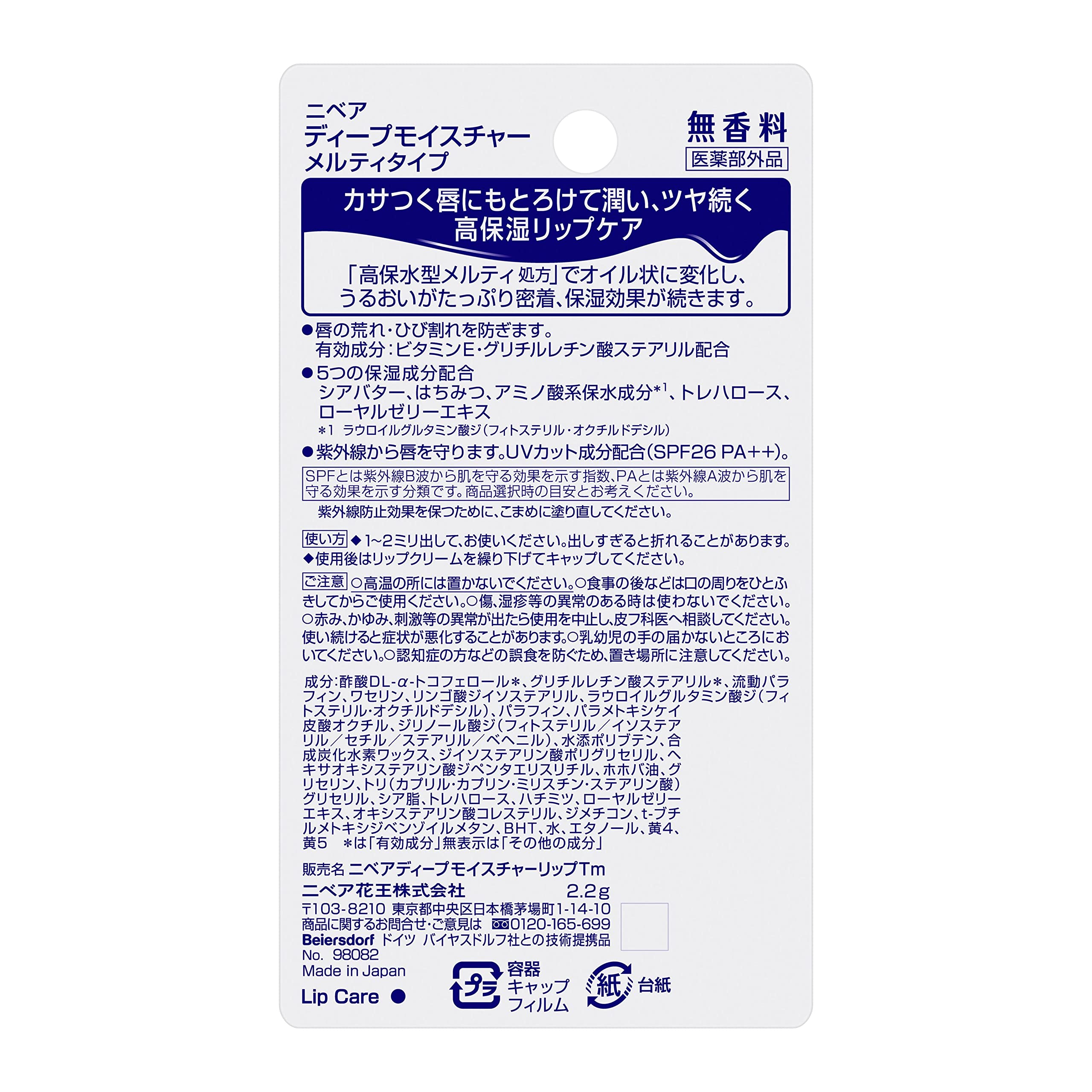 采用日本研发的「高保水型Melty融化配方」,接触双唇瞬间由奶油质地转化为润泽油状,形成锁水保护膜,长时间保持双唇水润光泽。