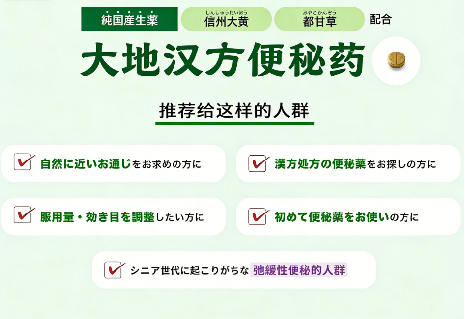 ● 「大地汉方便秘药」搭配本公司研发的信州大黄都甘草,采用沐浴北海道大地恩惠、由签约农户精心培育的纯日本国产生药制成。