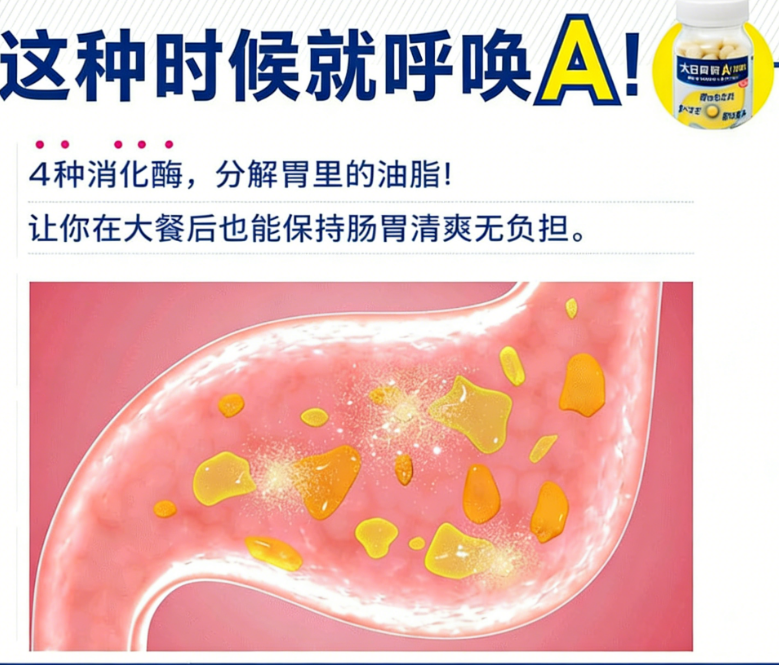 通过脂肪酶 AP6、熊去氧胆酸、Prozyme 6 以及生物淀粉酶 1000 的作用,对油腻饮食、饮食过量等引发的胃部积食具有良好效果。