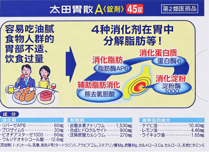 太田胃散 A【片剂】是通过分解胃部脂肪、减轻胃部负担,从而改善不适症状的肠胃药。