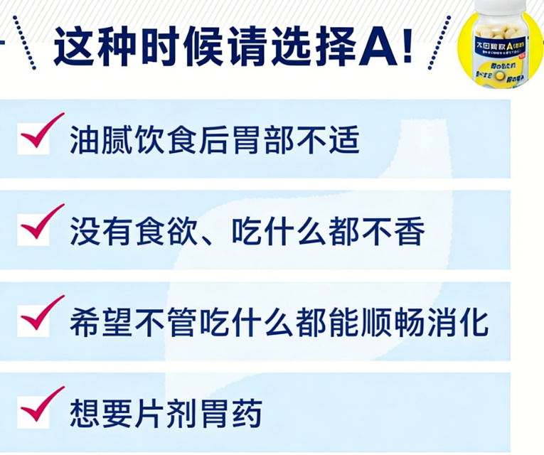 胃部积食、饮食过量、胃痛、烧心、食欲不振、消化不良、促进消化、饮酒过量、胃酸过多、胸闷、胃部不适、胃部及腹部胀满、胃弱、胃部沉重、呕吐、嗳气、恶心(胃部不适、宿醉恶心、反胃、想吐)