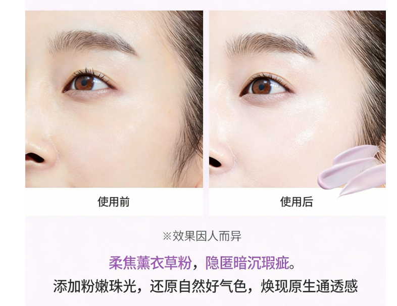 柔光提亮+妆前二合一:温柔薰衣草粉色调,上脸自然提亮肤色,修饰暗沉、不均,可直接作为妆前乳使用,后续上妆更服帖、不卡粉。