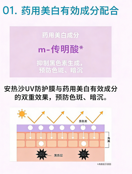 药用美白+防晒双在线:添加药用美白有效成分传明酸,抑制黑色素生成,预防色斑、雀斑,同时抵御紫外线伤害,防晒养肤一步到位(美白指抑制黑色素生成,预防色斑雀斑)。