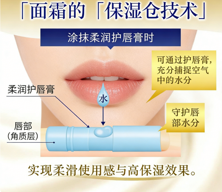 采用锁水科技,能感应唇部与空气中的水分,牢牢锁住滋润,转化为膏状保护膜。