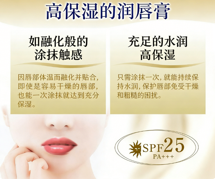 • 防晒防护:SPF25/PA+++ 防晒指数,有效抵御紫外线伤害,减少唇部暗沉、干裂。