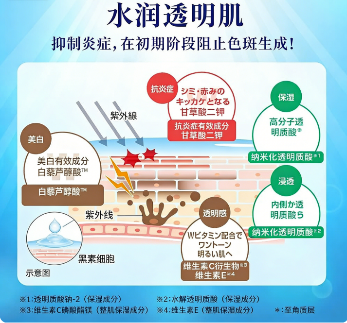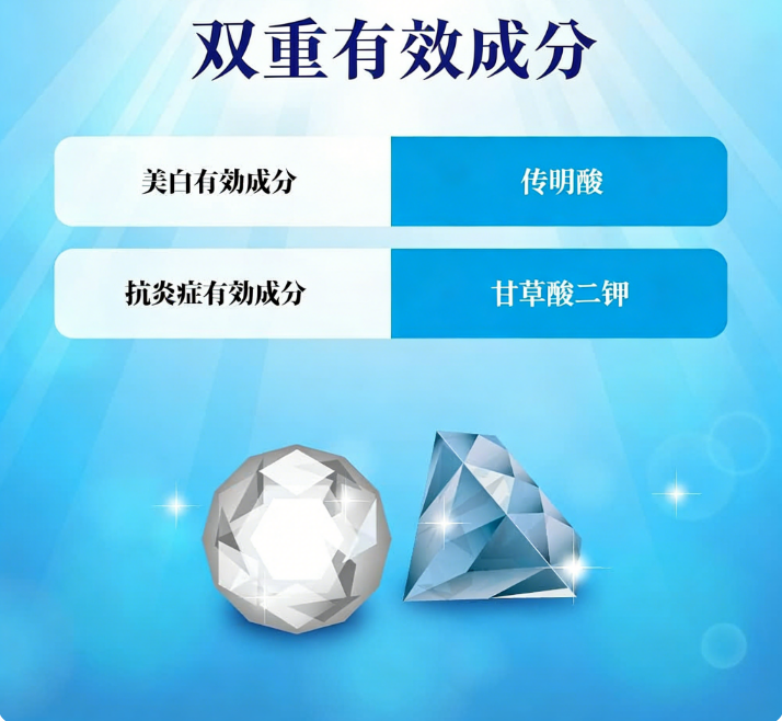 - 传明酸:有效美白成分,抑制黑色素,淡化预防色斑。