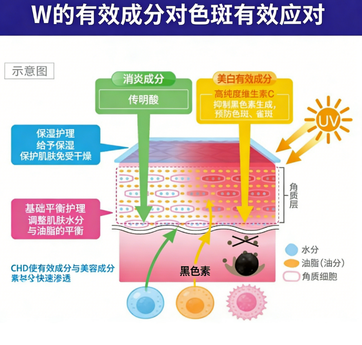 • 美白提亮:抑制黑色素,改善暗沉、色斑、雀斑,养出透亮肌;