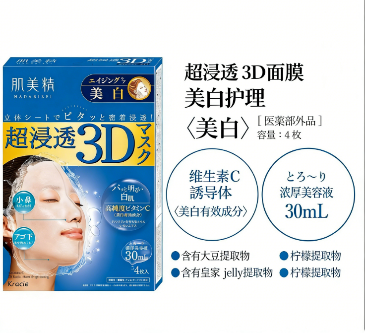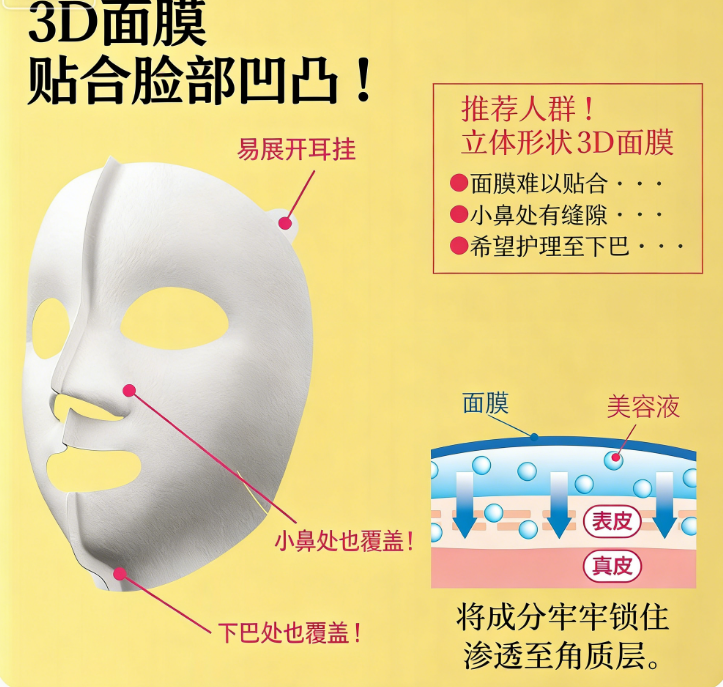 本品为肌美精超浸透 3D 面膜,贴合面部轮廓,精华渗透力强,温和不刺激。
