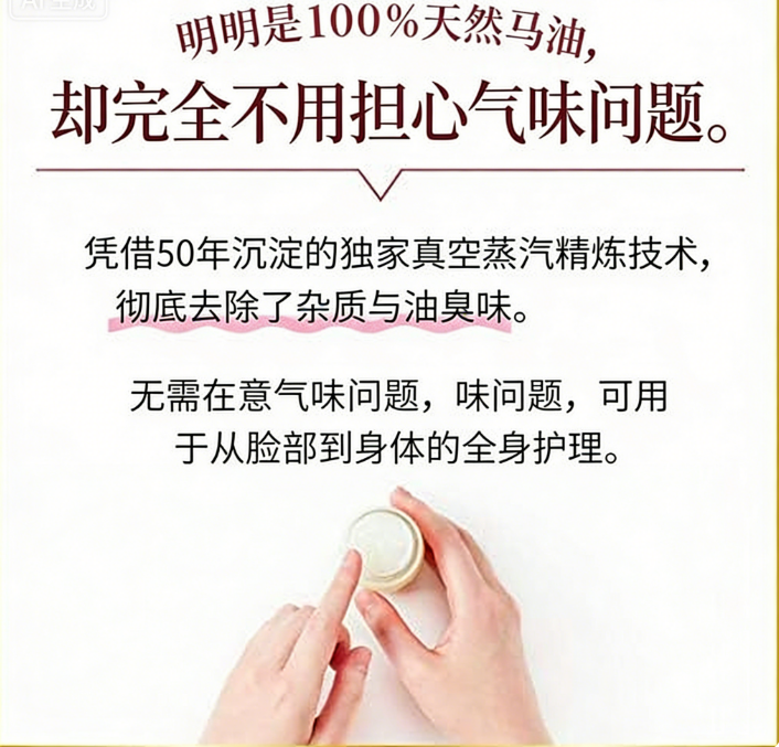 凭借多年沉淀的高精提纯技术,去除杂质,成为日本官方认可的皮肤保护专用护肤品,坚持打造正统高品质纯马油。