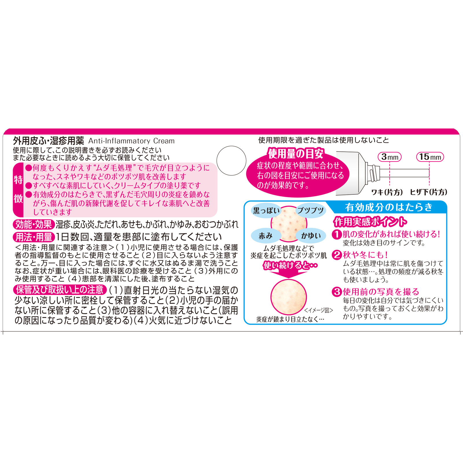 可消除因去除毛发等导致毛孔周围黑色素沉着引起的炎症,治疗湿疹和皮炎。本品配合5种有效成分,改善毛孔粗大的粗糙肌肤,恢复光滑素肌。质地顺滑的乳霜型治疗药,每日可涂抹数次。