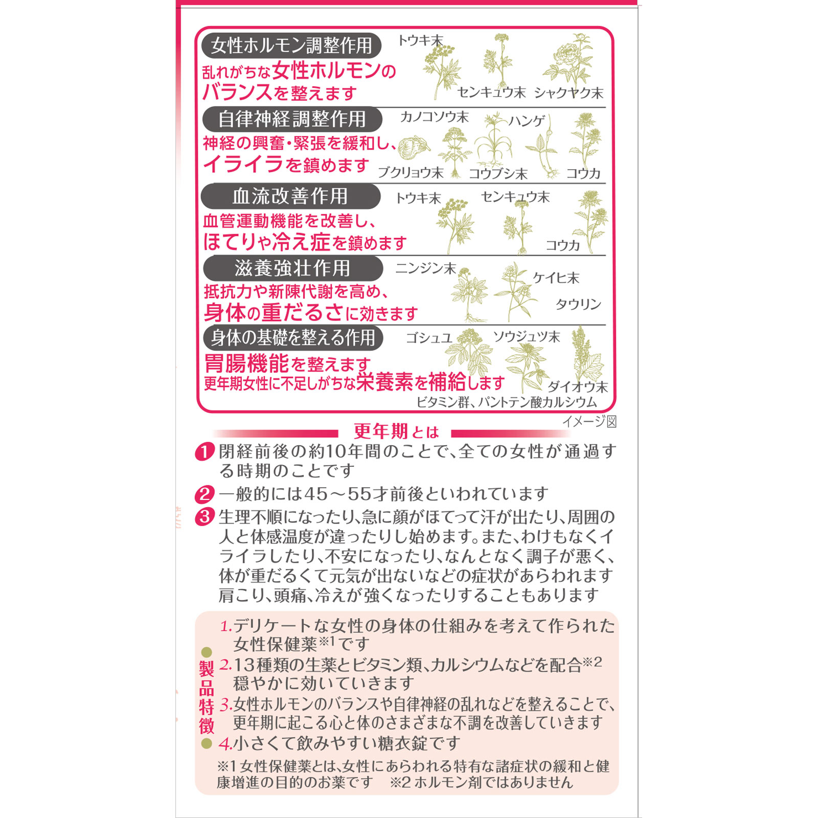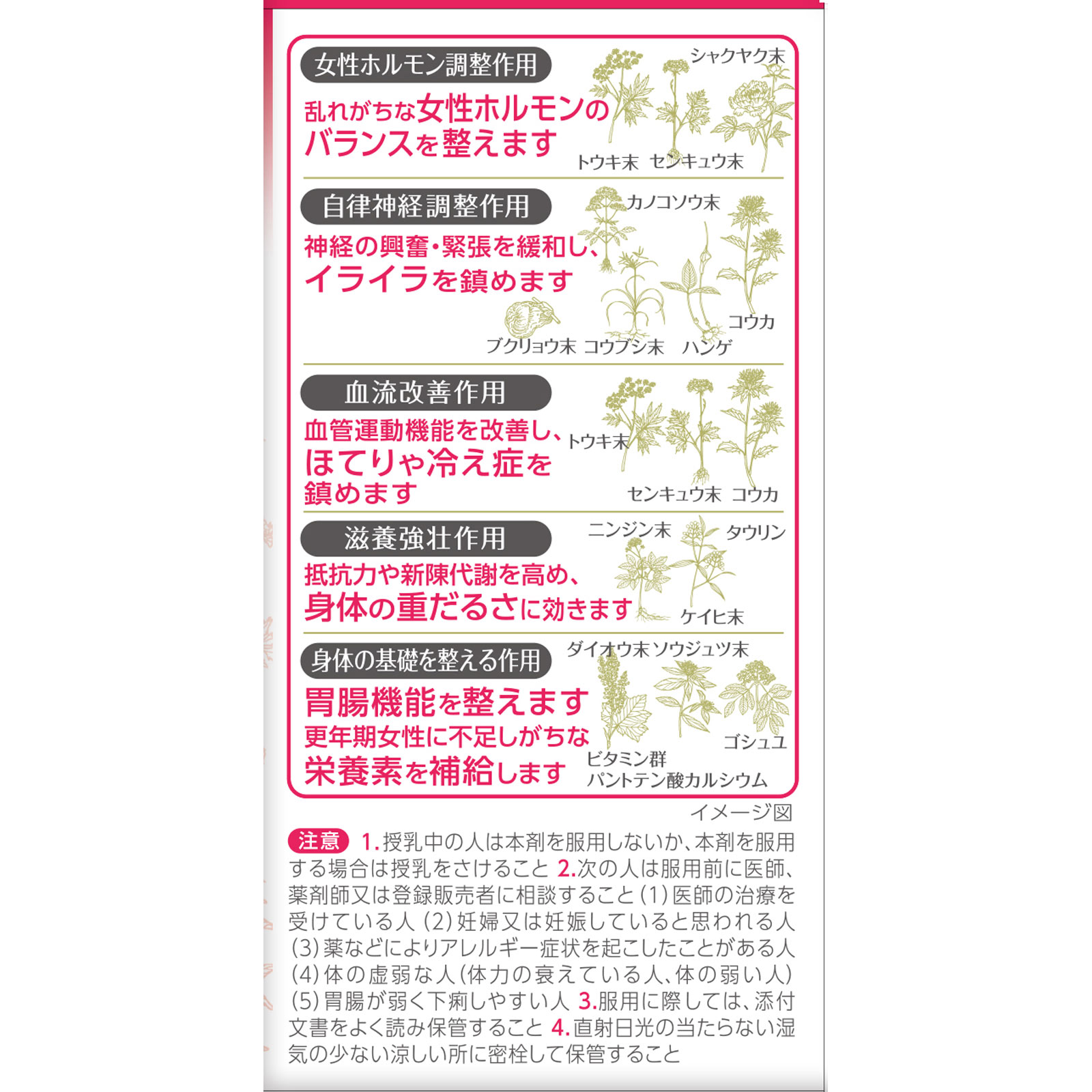 更年期障碍、更年期神经症、月经不调、月经异常、痛经、肩膀僵硬、冷症、皮肤粗糙、眩晕、耳鸣、心悸、贫血、痤疮、便秘、歇斯底里、白带、产前产后调理、下腹腰痛、血压异常、头痛、头重