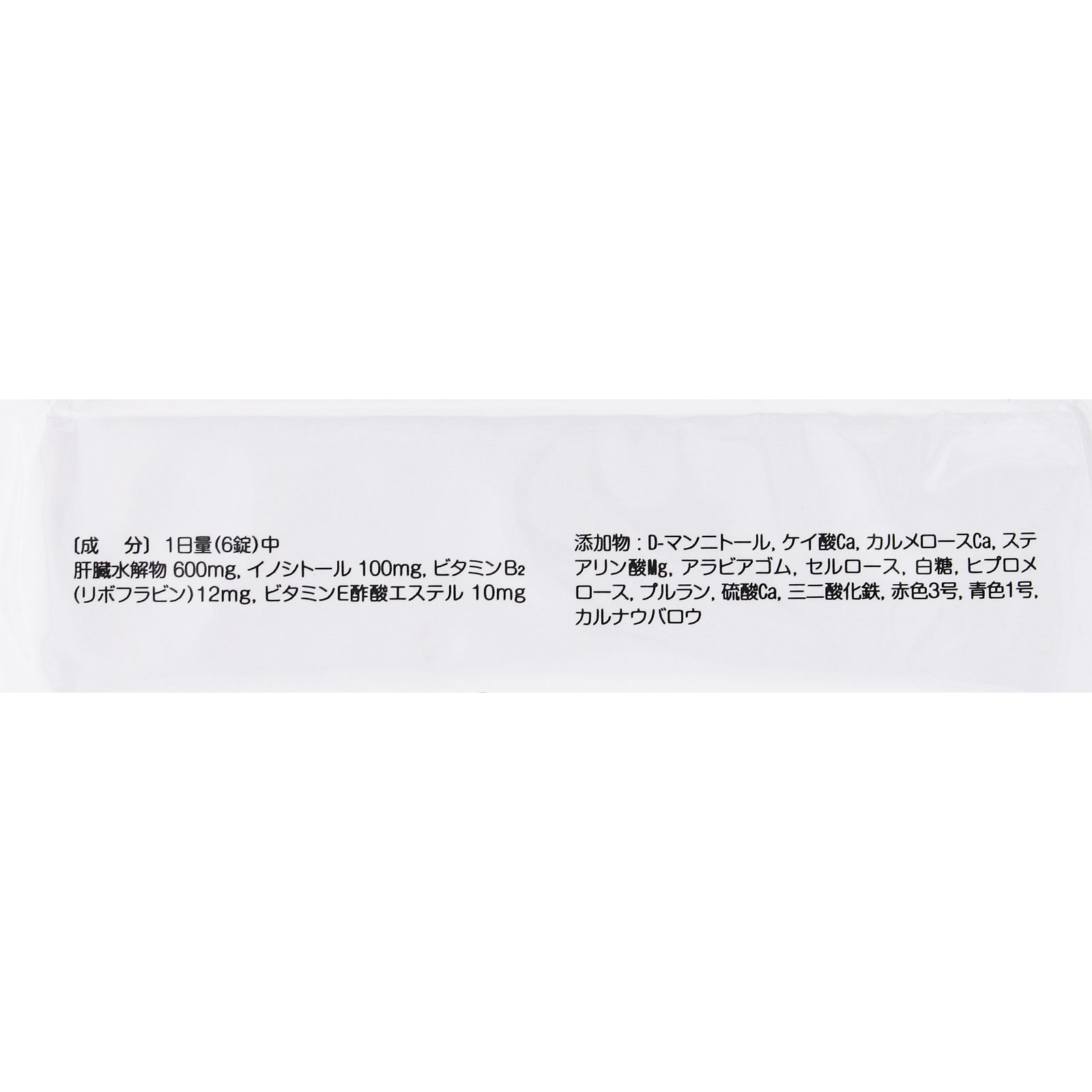 每日量(6片)含:肝水解物600mg;肌醇100mg;核黄素(维生素B2)12mg;维生素E醋酸酯10mg;盐酸吡哆醇(维生素B6)10mg;烟酰胺30mg;泛酸钙15mg