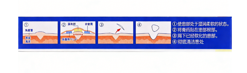 可软化增厚、变硬的皮肤,去除鸡眼、老茧、疣。药剂部分具有粘性,