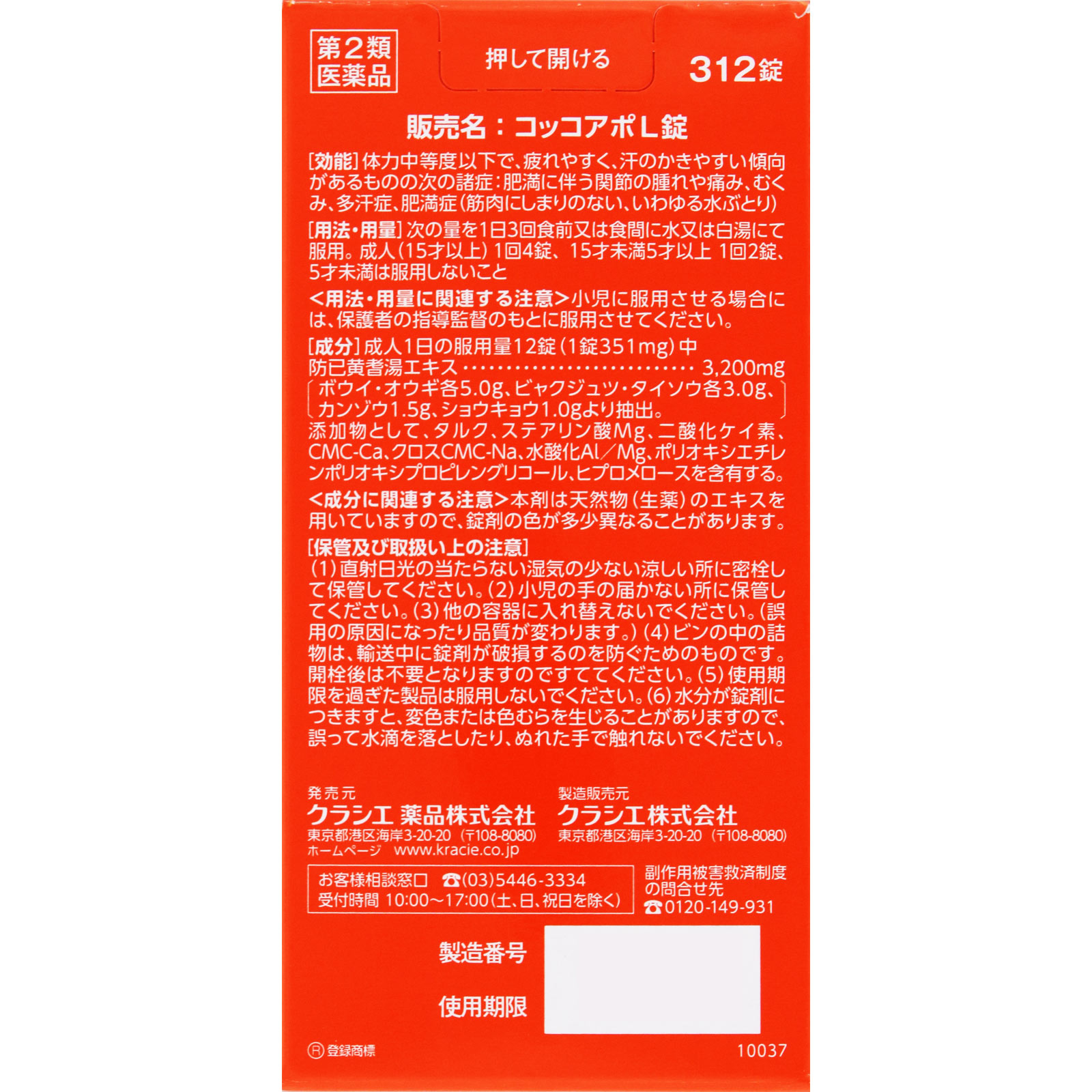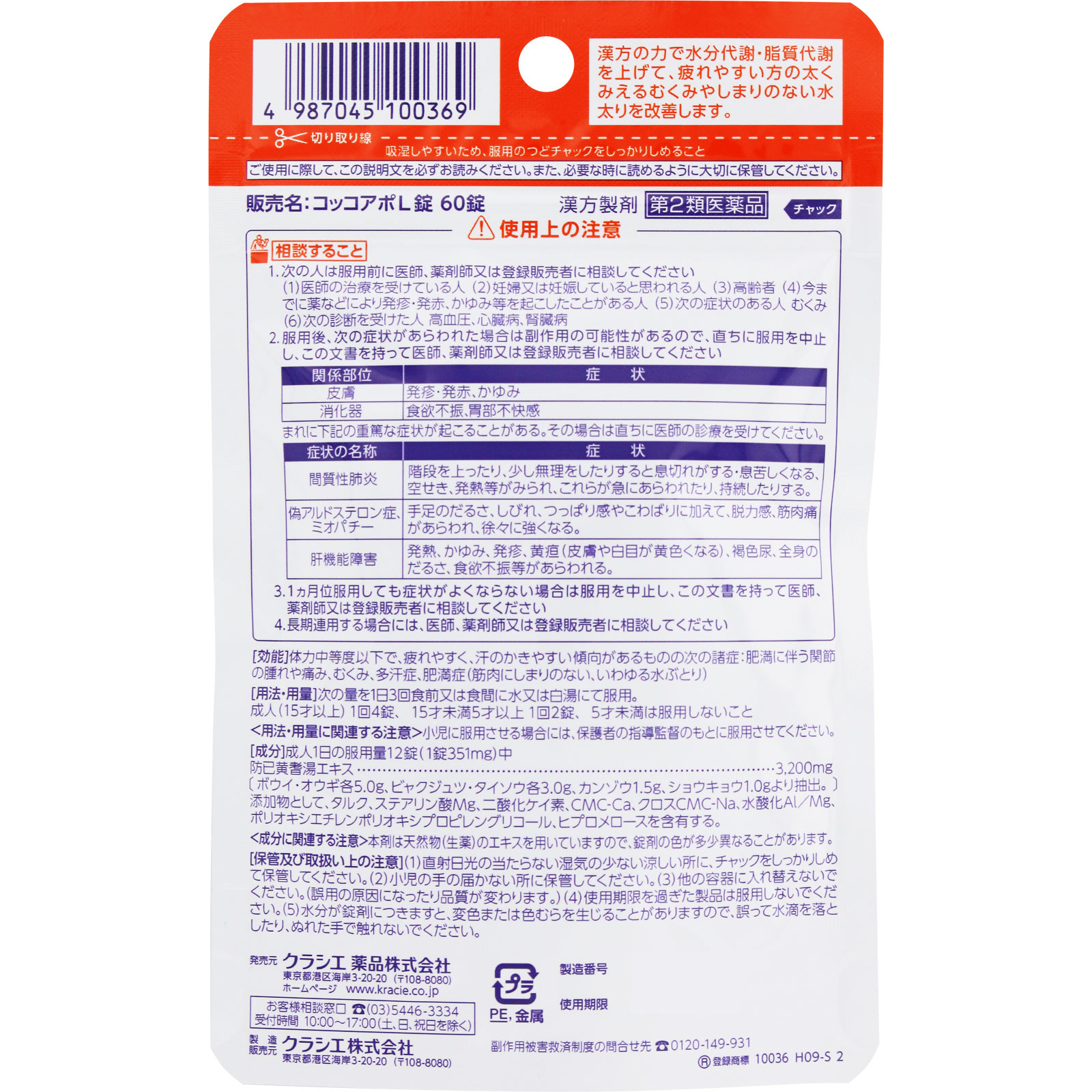 日本直邮 汉方克拉西 防己黄芪汤L减脂片 60片【第二类医药品】