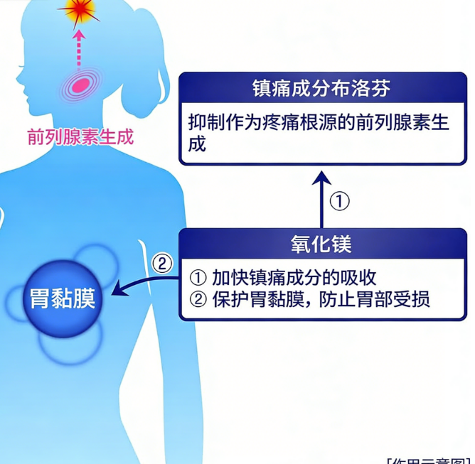 还添加了氧化镁—— 该成分既能保护胃黏膜,又能促进布洛芬吸收。