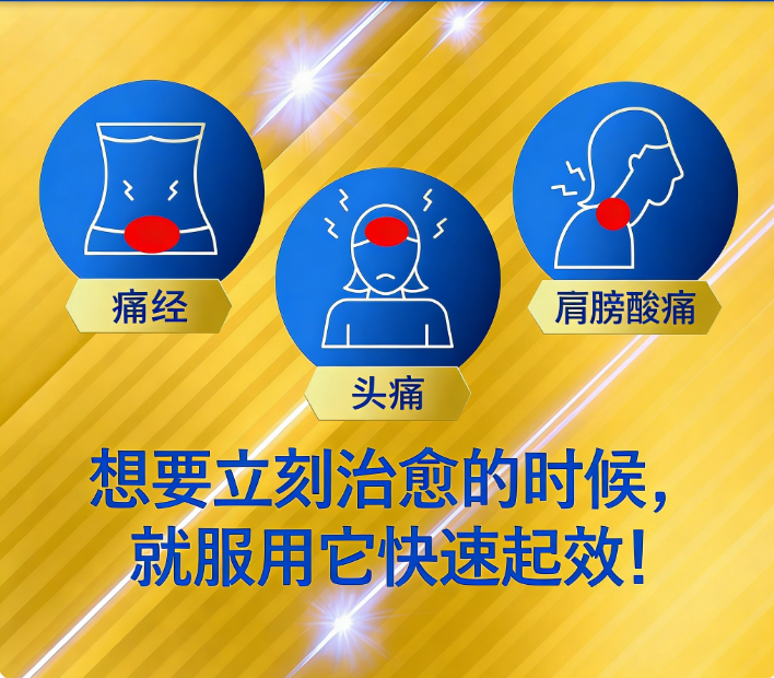 • 头痛、痛经、肩颈痛、牙痛、咽喉痛、关节痛、肌肉痛、神经痛、腰痛、拔牙后疼痛、跌打痛、耳痛、骨折痛、扭伤疼痛、外伤痛的镇痛