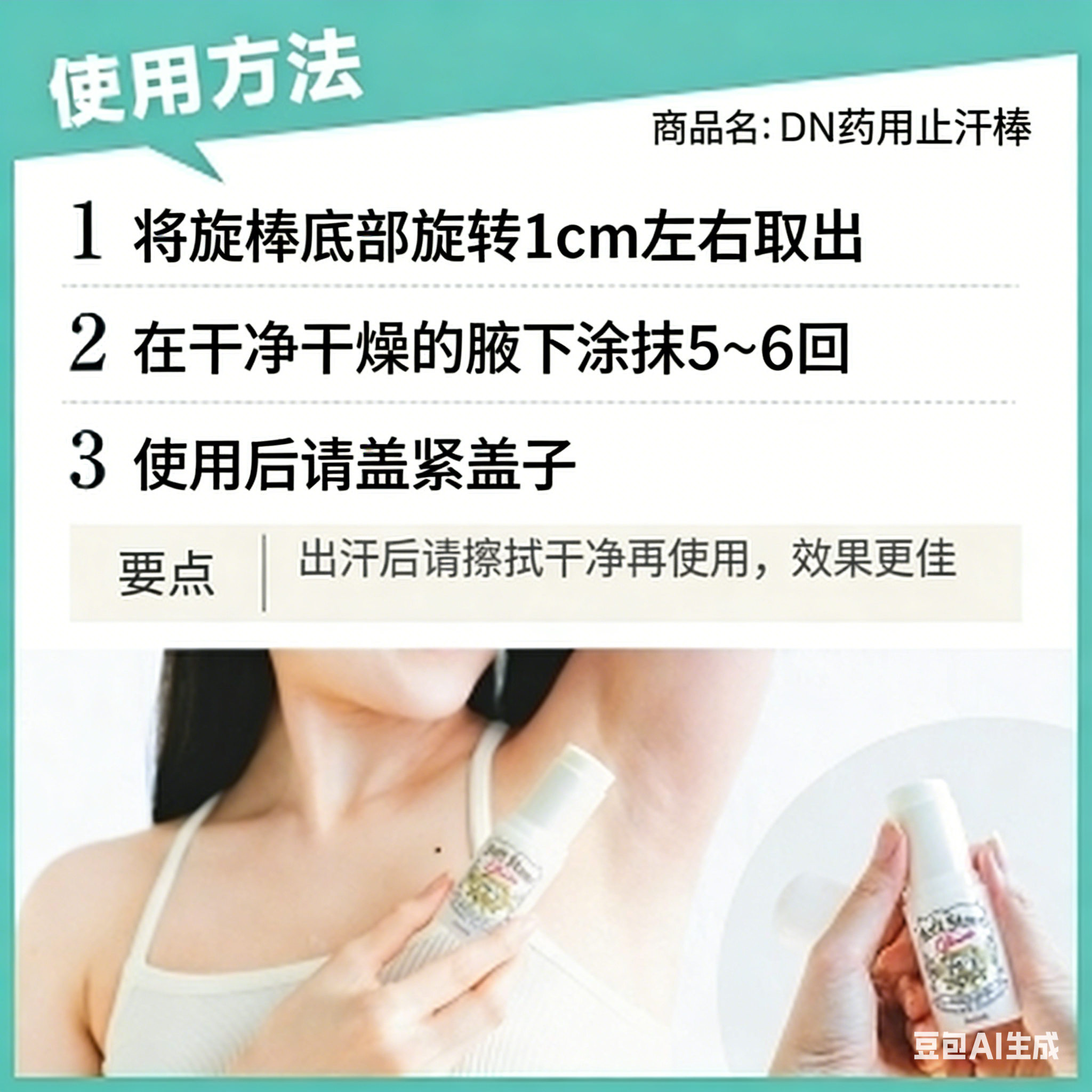 采用直涂式棒状设计,操作简单便捷,忙碌清晨可快速完成涂抹,无需等待干燥,省时又省心。棒状版型顺滑易涂,建议旋转底部推出1cm左右(注意不要推出过长,避免折断),在干燥清洁的腋下往复5-6次均匀涂抹即可,使用后记得拧紧瓶盖。涂抹后即刻呈现干爽触感,不黏腻、不粘衣,不易留下白痕,穿深色衣物也无需担心蹭染,出汗后擦干肌肤再使用,抑汗效果更出众;若感觉棒体偏硬,可先用纸巾去除表面硬化部分再使用。