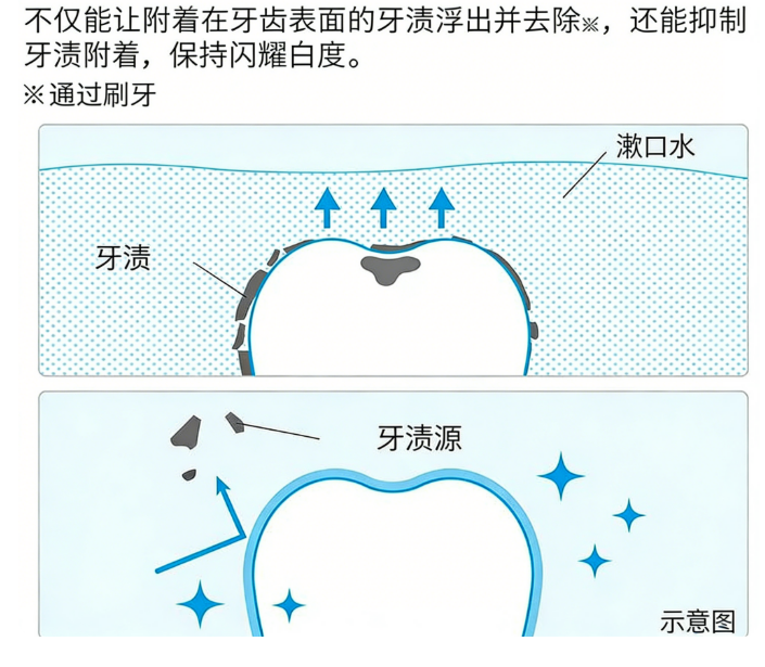 采用美白持效配方,能浮起牙齿表面附着的牙渍,清洁更轻松;同时抑制后续牙渍再次附着,持续守护闪耀亮白的牙齿。
