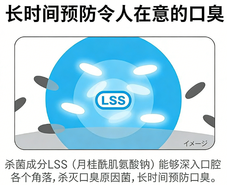 直接发挥杀菌成分强效作用,可深入口腔各个角落杀灭口臭原因菌,从根源上长时间预防口臭困扰,时刻保持口气清新。