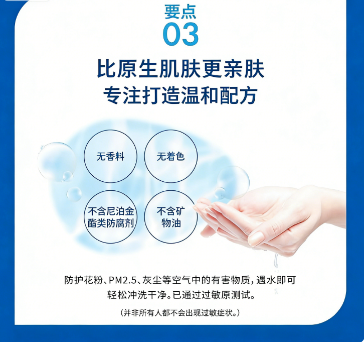 无香料、无色素、无矿物油、无 parabens 防腐剂,