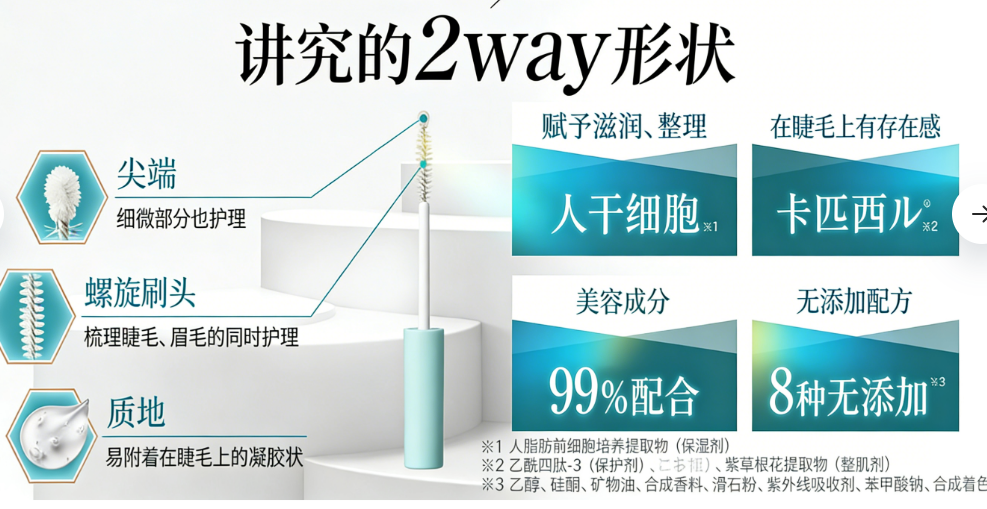 - 2WAY 刷头:兼具精准刷头与螺旋刷,可轻松涂抹睫毛、眉毛及泪袋等细微部位。