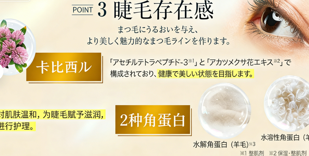 本品富含多种珍贵美容成分,为睫毛提供全方位滋养: