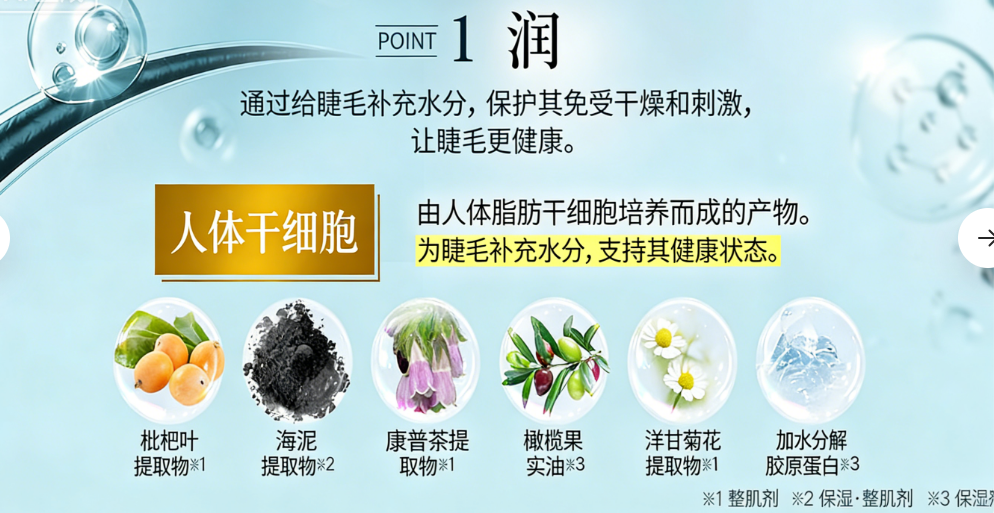 - 人干细胞培养液提取物、康富力叶提取物:修护受损,焕活睫毛健康状态。