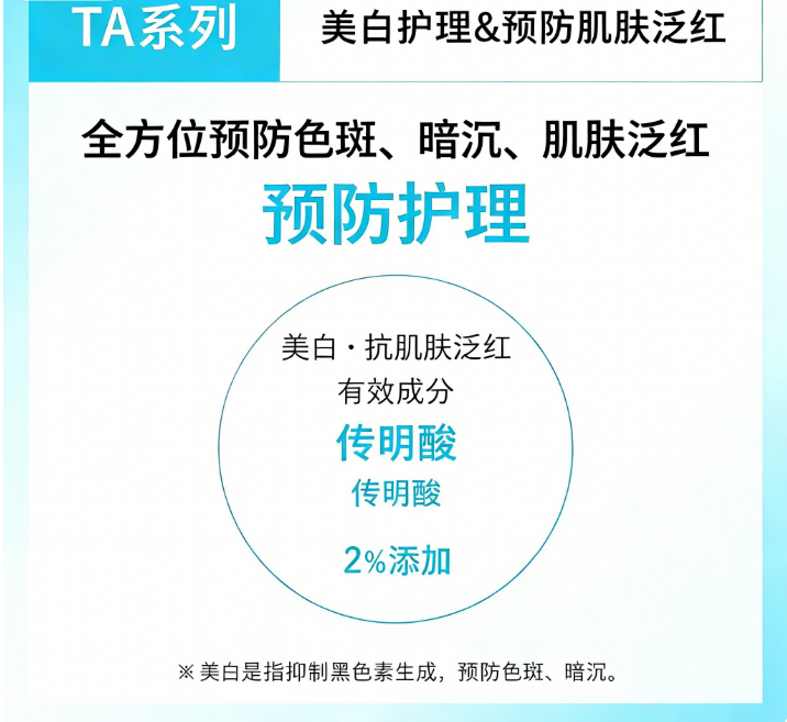 - 有效成分:传明酸 2% —— 美白淡斑、改善泛红、预防色斑