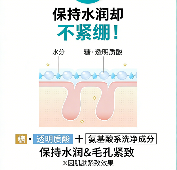 【保湿成分】透明质酸钠、甘油、尿囊素,清洁后锁住肌肤水分,缓解干燥紧绷;