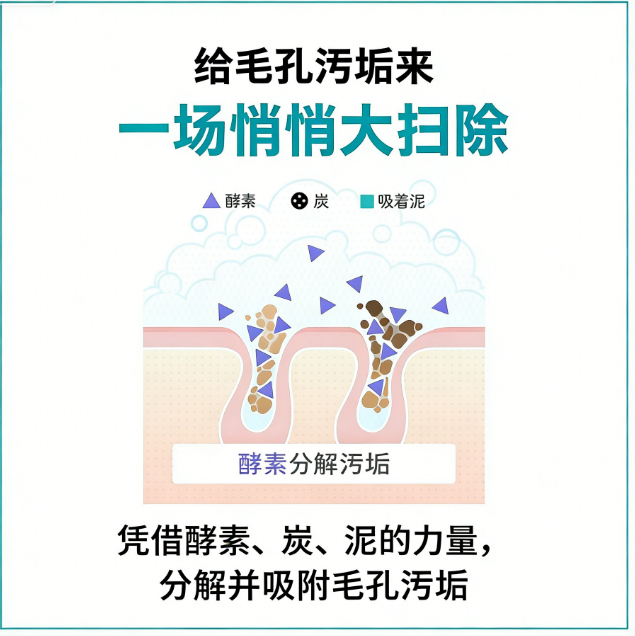 【清洁成分】酵素(蛋白酶)、炭、泥(碧玄岩)、椰油酰甘氨酸钾等温和表面活性剂,深层清洁同时温和护肤;