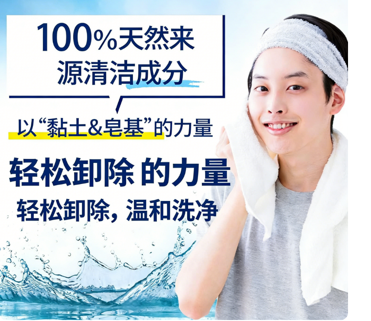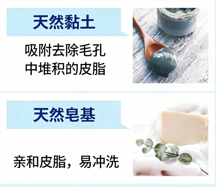 - 天然清洁成分 + 专业配方,深入吸附顽固油脂与毛孔污垢,温和不紧绷