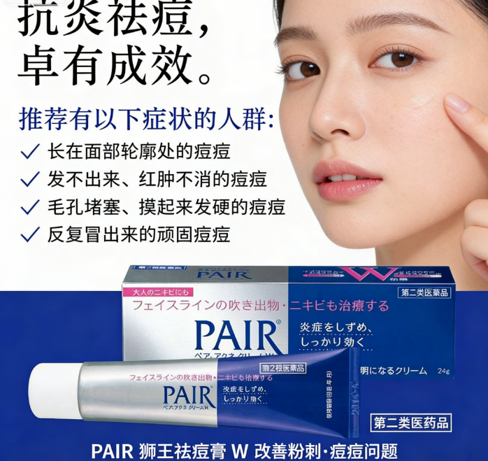 - 取适量 PAIR ACNE 祛痘膏 W 于指尖,轻轻涂抹在长有粉刺、痘痘的部位。