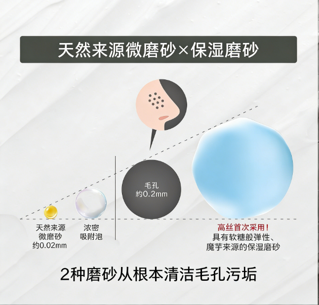 - 双重磨砂颗粒:天然来源微磨砂 + 保湿磨砂粒子,深入清洁毛孔