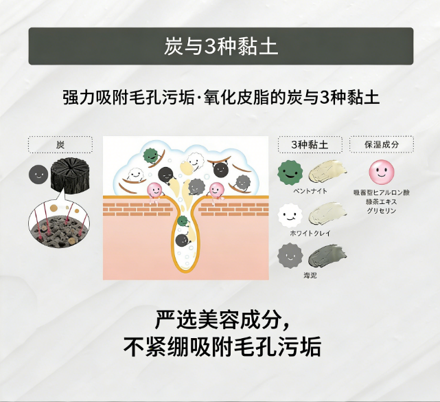 - 炭 + 3 种矿物泥:吸附油脂、黑头、角栓,净化毛孔