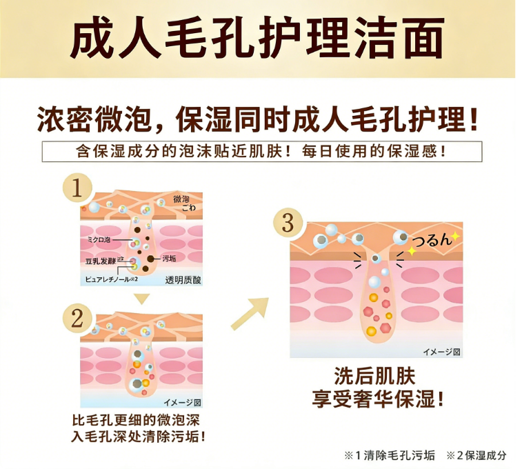 - 毛孔清洁:浓密泡沫包裹并带走毛孔内堆积的皮脂与老废角质,改善毛孔粗大与暗沉