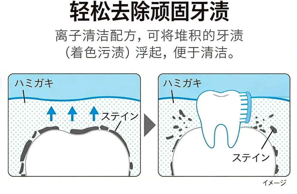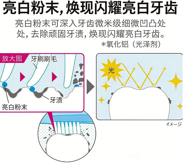 • ● 离子清洁配方,深层去渍亮白 离子清洁配方可将牙齿表面堆积的牙渍浮起,更易清洁;搭配亮白粉末(氧化铝),能深入牙齿细微凹凸处,去除难以清理的顽固牙渍,让牙齿恢复光滑透亮的白皙质感。