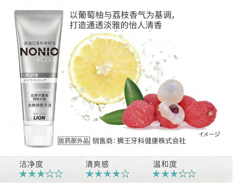 源自口臭科学研发的「NONIOプラスホワイトニング ハミガキ」,既能实现彻底的口臭护理,又能强效去除顽固牙渍,帮你养成光滑亮白的健康牙齿,兼顾清洁、美白与口气清新,是日常口腔护理的优选好物。