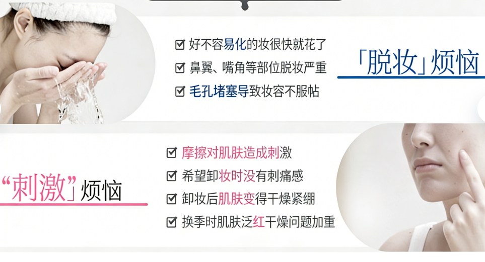 - 柔滑美容液质地,温和融妆,不闷肤、不糊眼